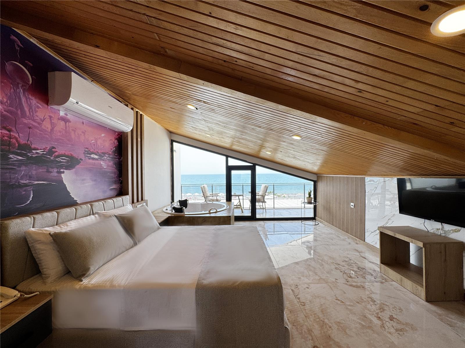 Hawaii Beach Resort Hotel’in Jakuzi Terrace Deluxe Odası, GTA Hawaii ruhunu modern şıklık ve doğal ahşap dokunuşlarla birleştirerek misafirlerine benzersiz bir konfor sunar. Deniz manzaralı geniş terasınızda gün batımının keyfini çıkarabilir, odanızın içindeki özel jakuzi ile köpüklü bir keyfe dalabilirsiniz. Her detayda lüksü hissetmeniz için odalarımızda TV, mini bar, özel banyo & WC gibi tüm donanımlar eksiksiz olarak sunulur. Ahşap detaylarla tasarlanmış Jakuzi Terrace Deluxe, Hawaii’nin ayrıcalıklı atmosferinde hem denizi izlemek hem de kendinizi özel hissetmek isteyen misafirlerimiz için ideal bir seçimdir.